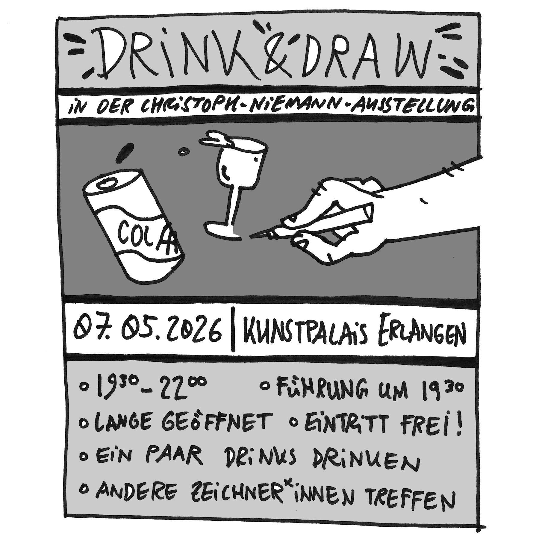 Ein kreativer Abend in geselliger Runde – erlaubt ist, was gefällt. In munterer Gesellschaft wird gezeichnet, getrunken und geredet. Egal ob Anfänger oder Profi, im Mittelpunkt stehen Kreativität, Austausch und Spaß. Mit dabei ist der preisgekrönte Nürnberger Comic-Zeichner Jeff Chi, der für Plausch und Ratschläge paratsteht.